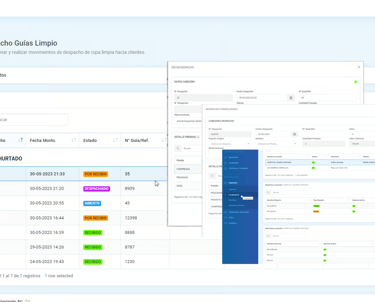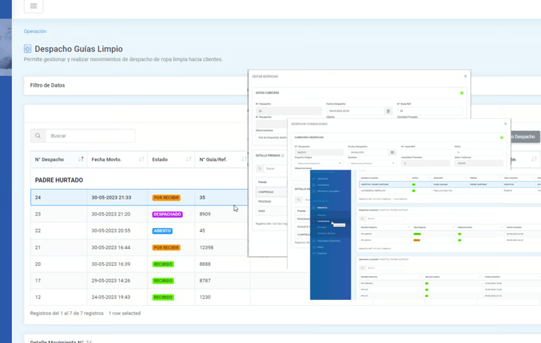 Sistema operacional para el registro, control y seguimiento del lavado de prendas para lavanderías industriales. Contempla múltiples clientes, locaciones, roperías y servicios, así como también el control de deuda por unidad logística de control (roperías y servicios).